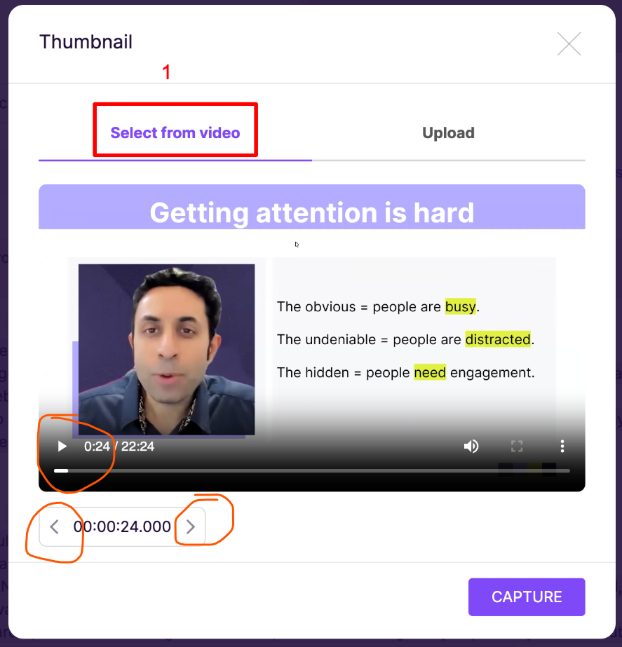 1) Select from Video: Select the exact frame from the video to use as thumbnail by either playing the video and pressing pause OR clicking on the right or left arrow on the timestamp: