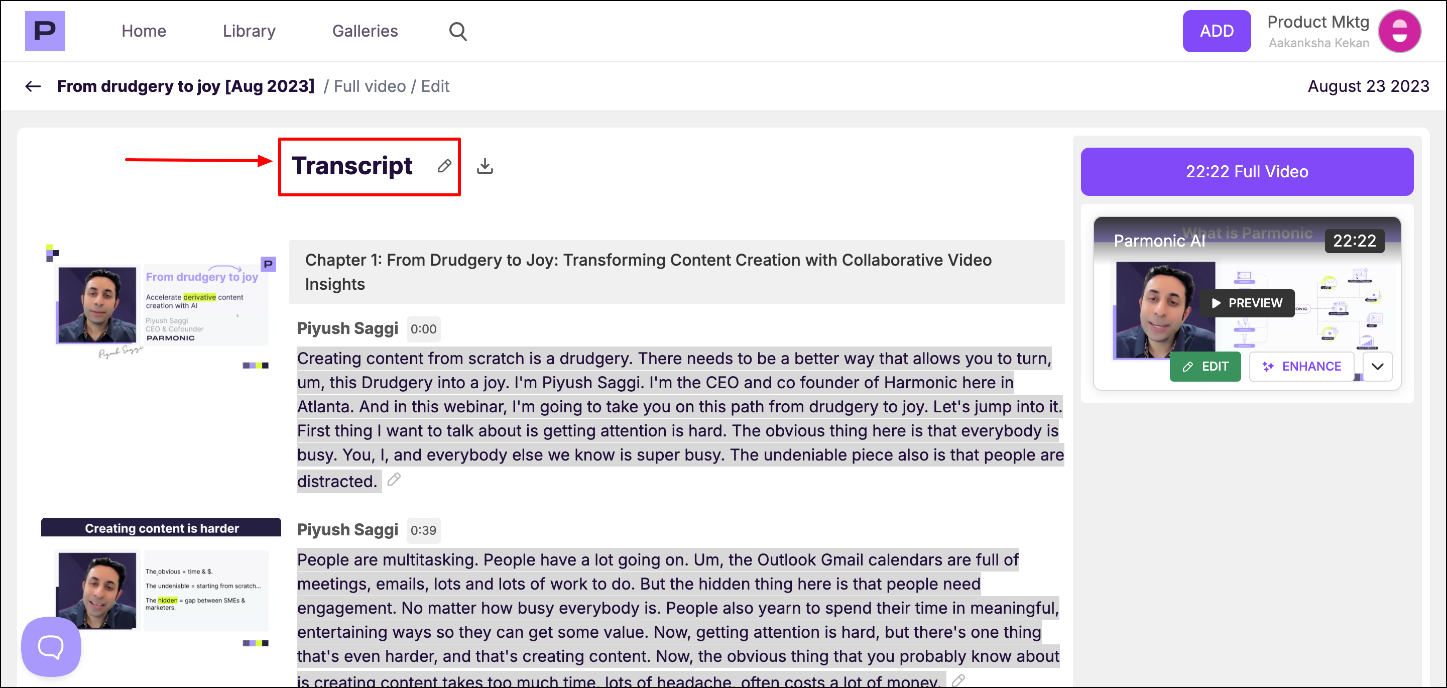 It's easy to edit your full video in Parmonic and remove unwanted portions using the transcript-based highlighter. You can then use this cleaned-up version as content or use the moments.