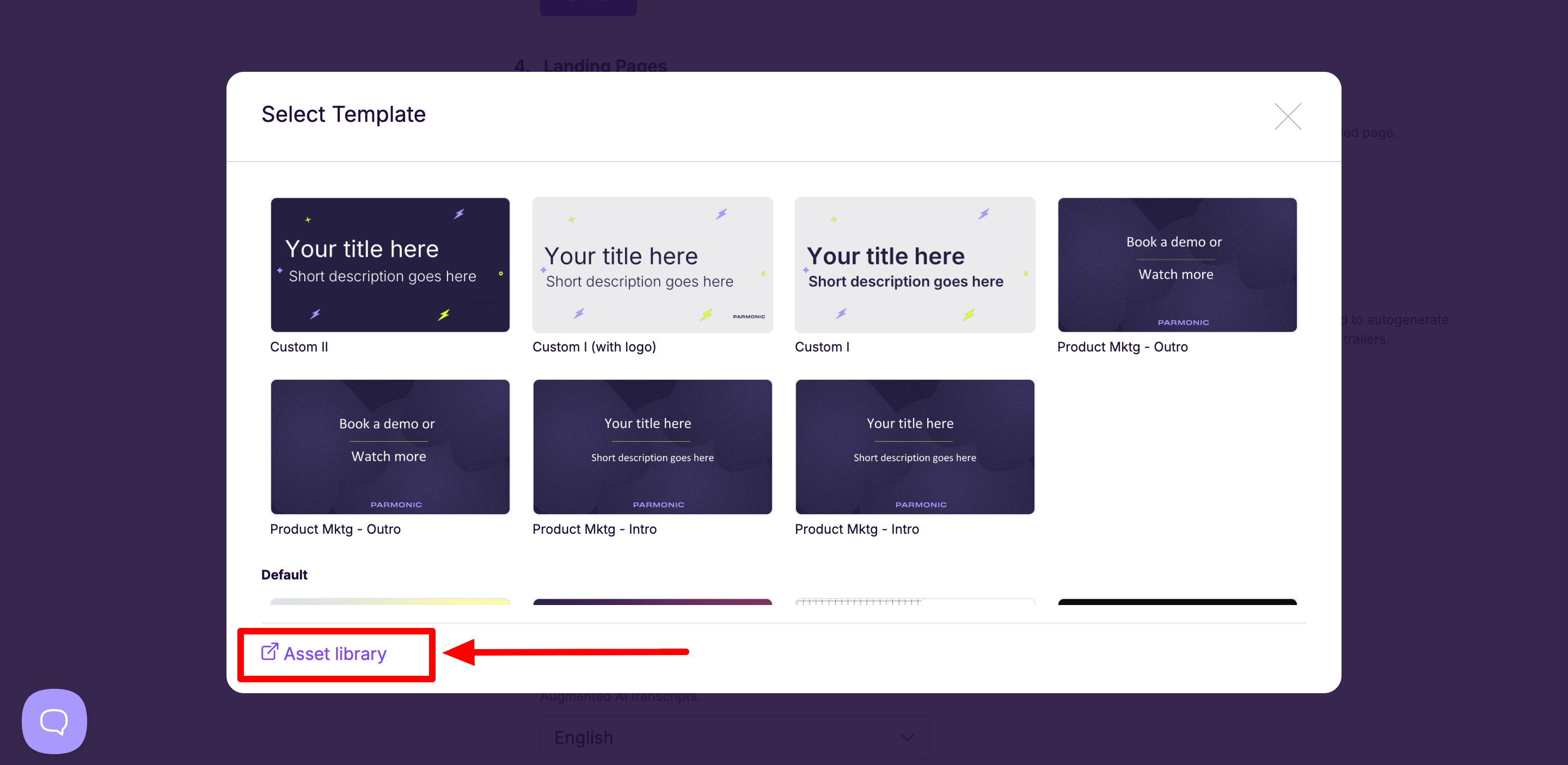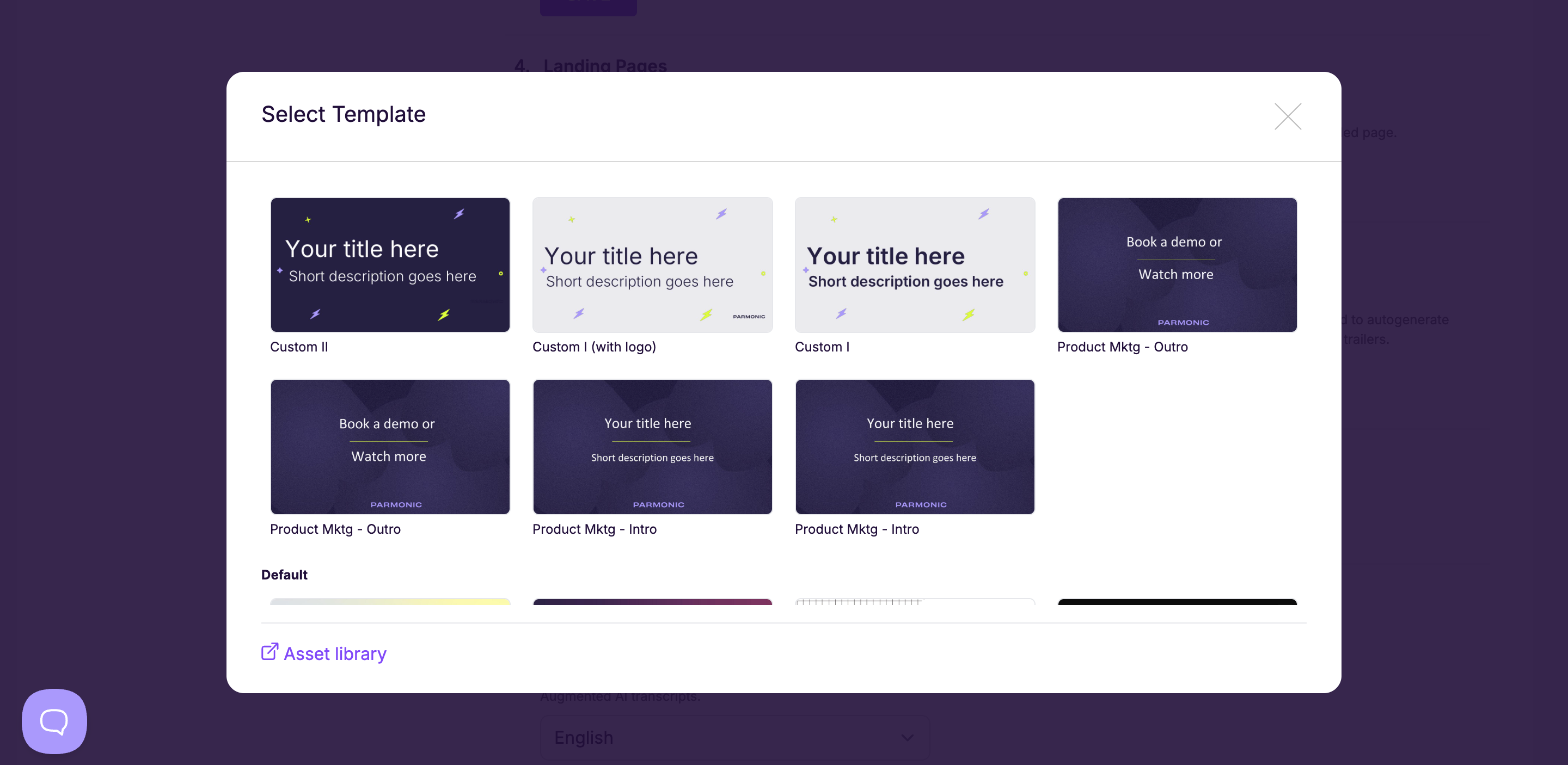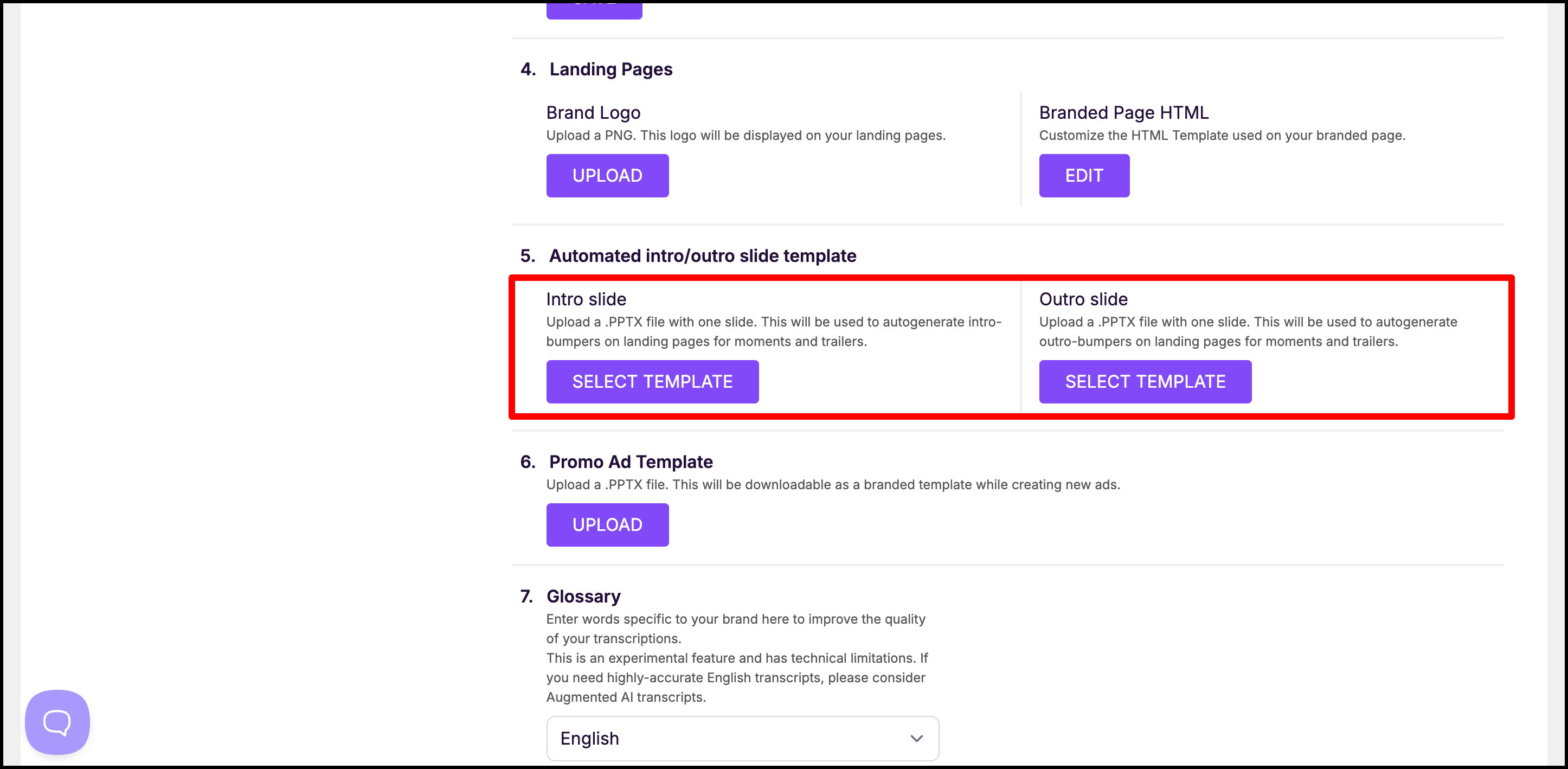 - In the Brand Settings Tab, click on 'Select Template' for intro and outro bumper slide
