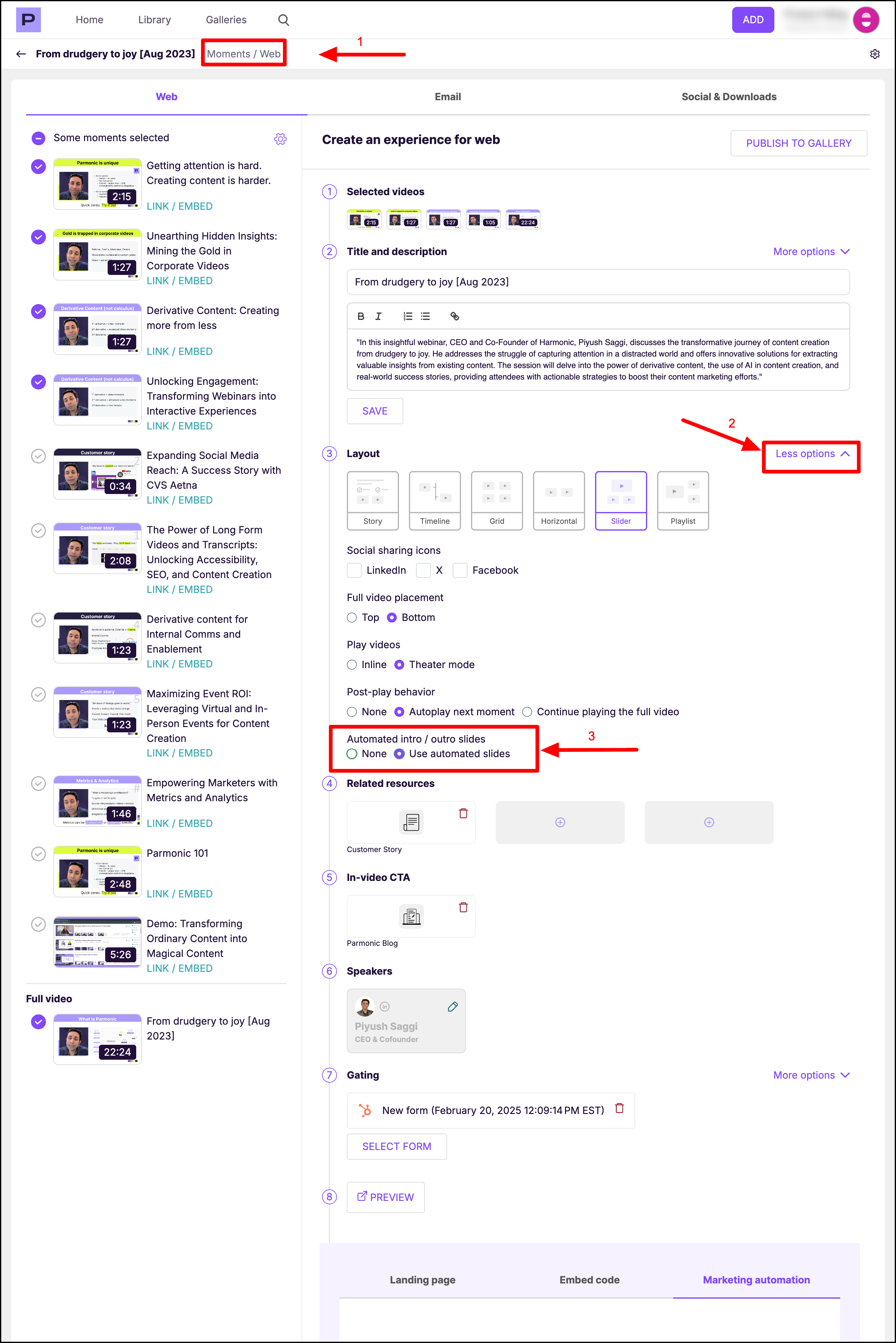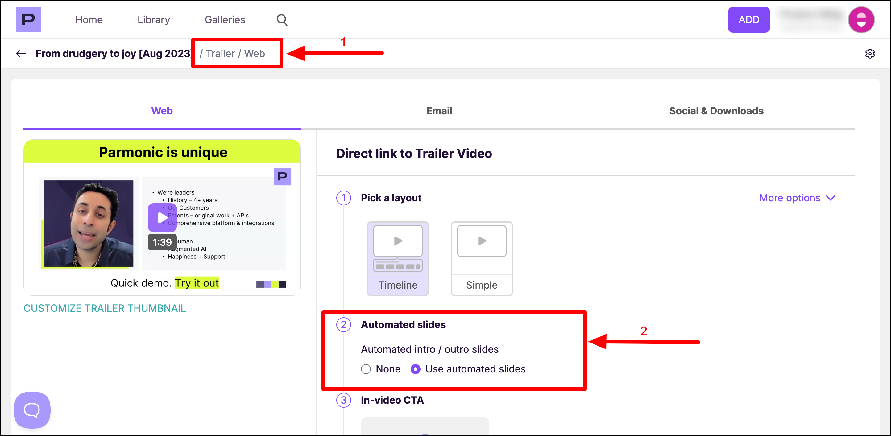 A 2 second Intro and a 2 second Outro will be added to videos (moments and the trailer) for either the direct link (parmonic.ai based) or embed of any single video.