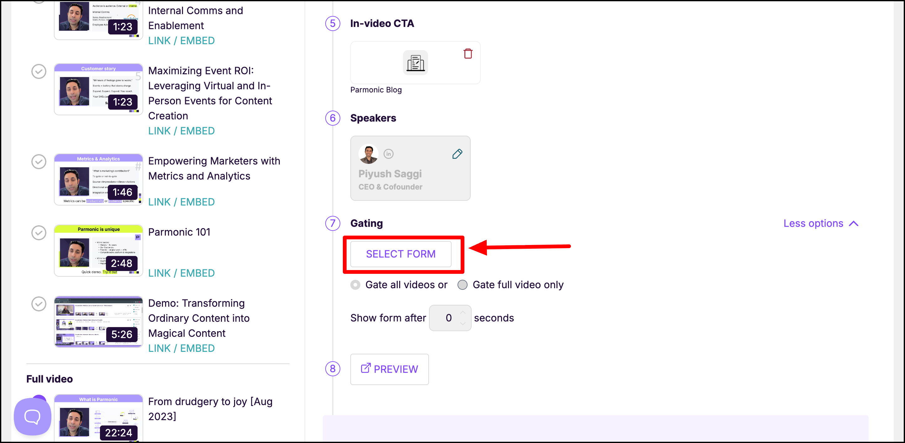 Choose from the list of available forms. You can also select between gating all videos or just the full video.