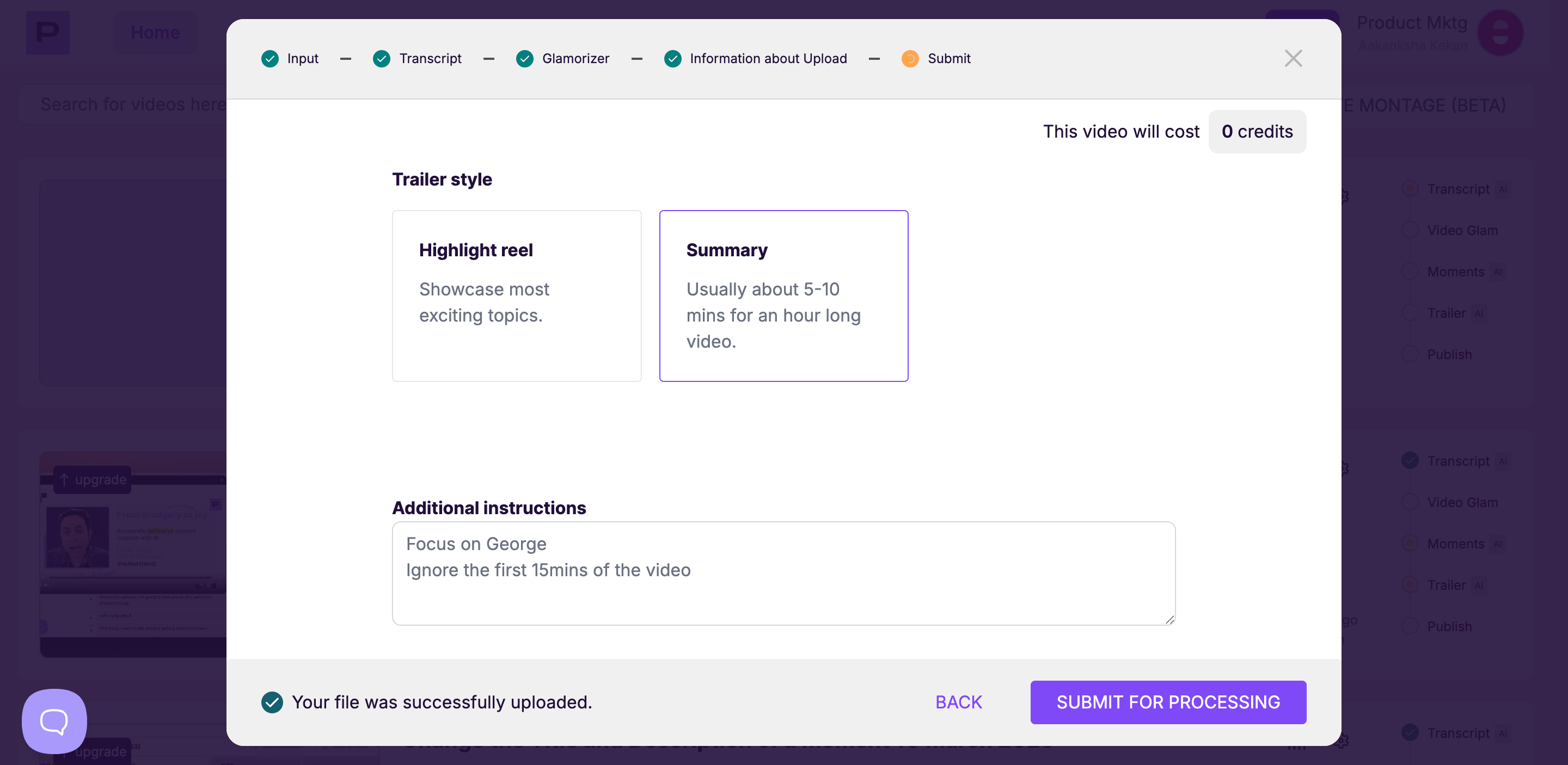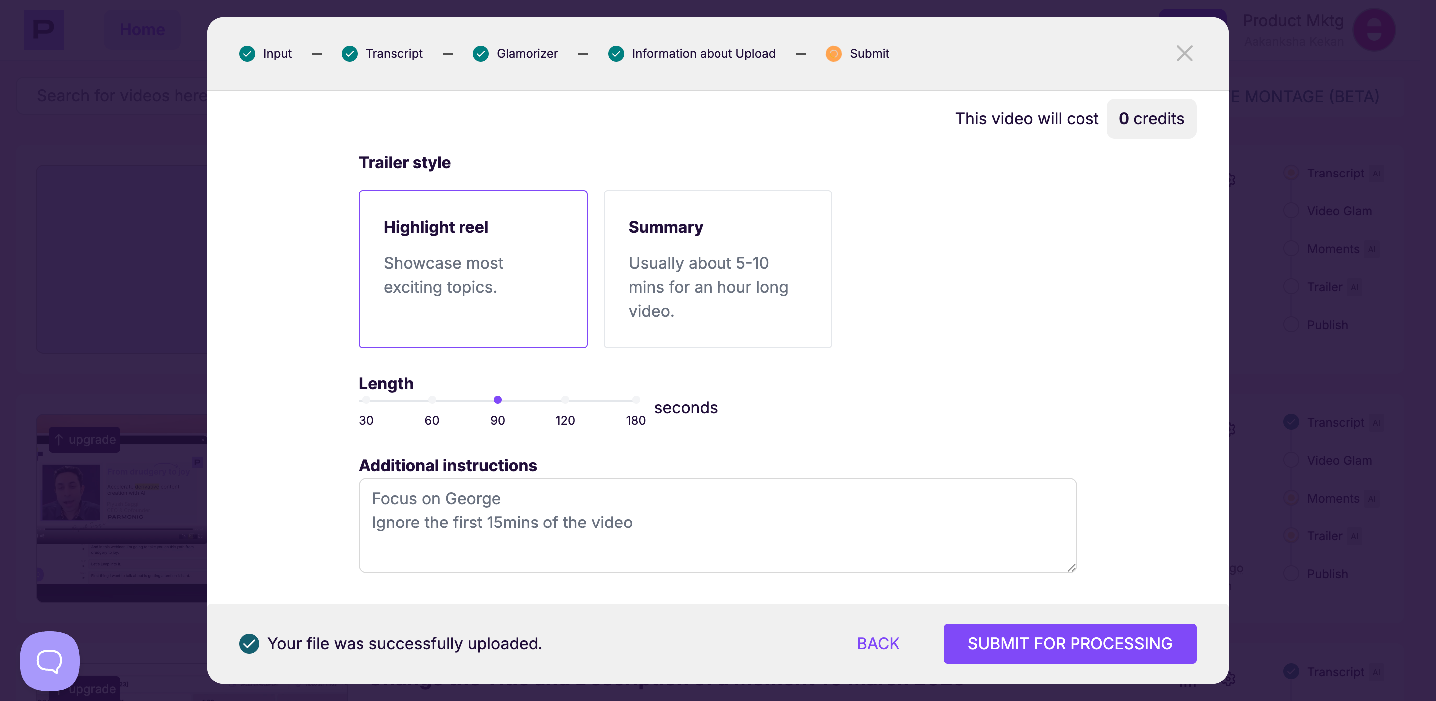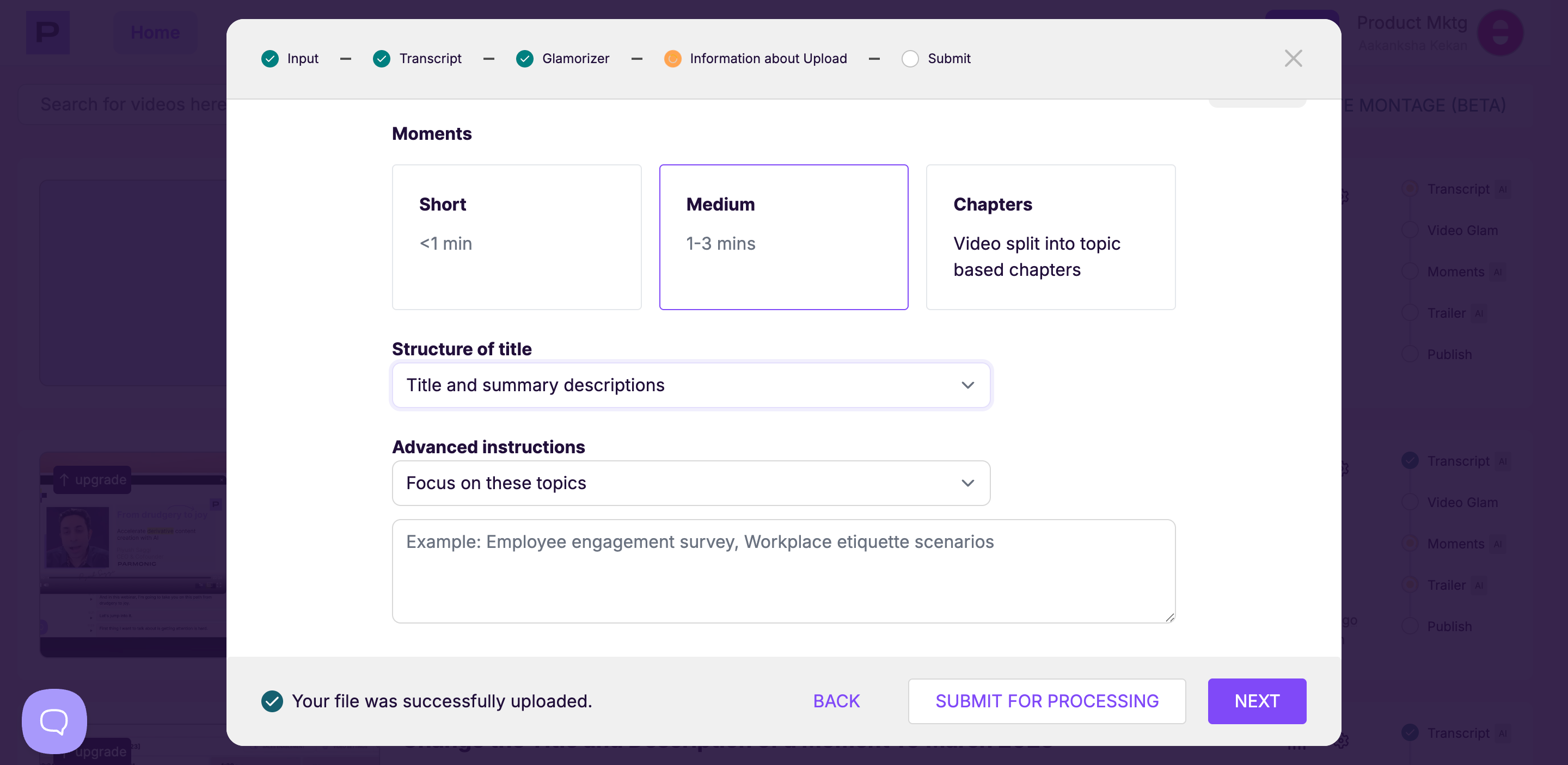 While your video is uploading, you can give AI additional information so that it creates moments tailored to your needs. To customize your moments and trailers, follow the steps here - https://help.parmonic.com/article/448-custom-moments-trailers
