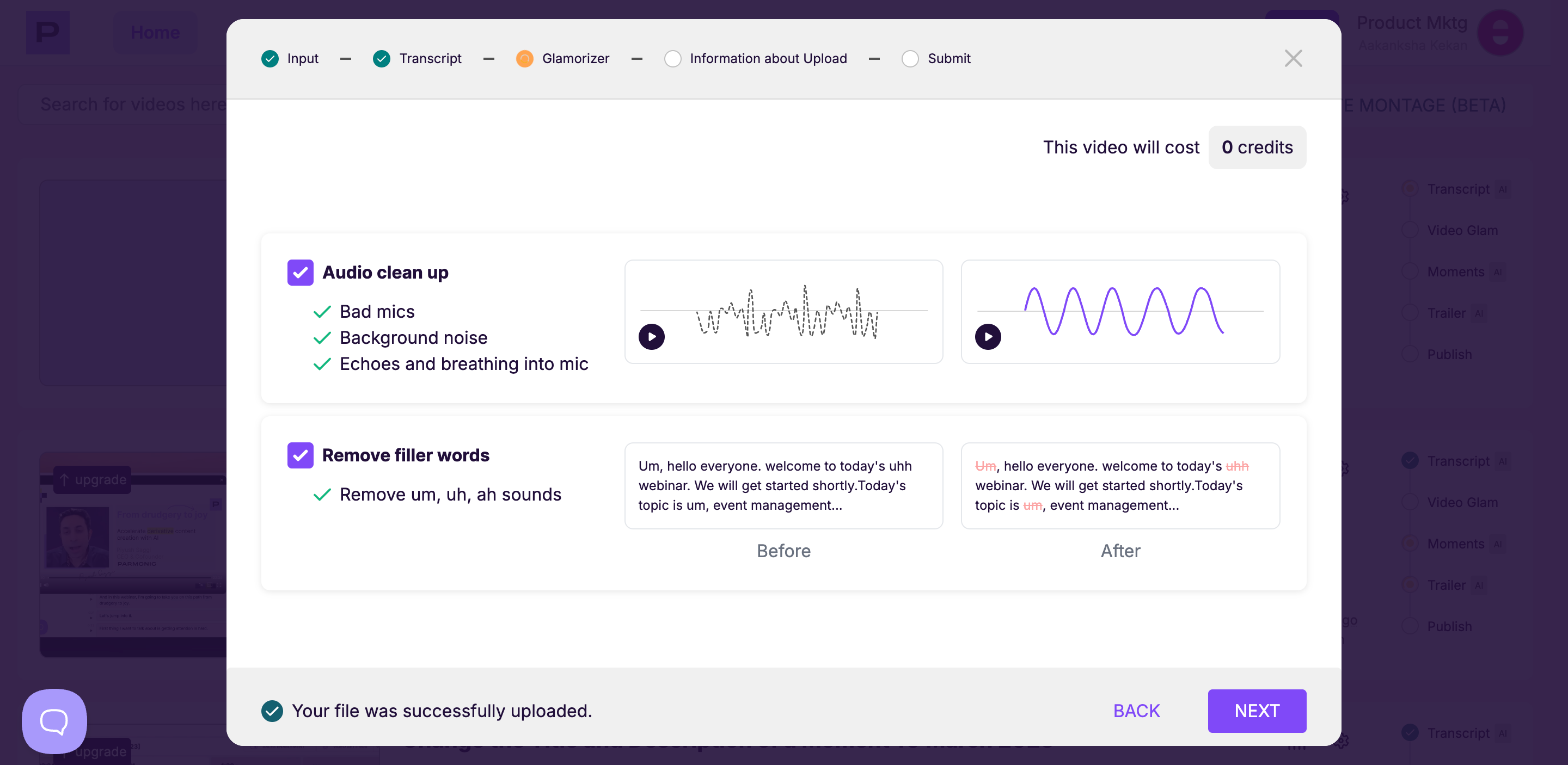 Step 8: Enhance the sound quality of your uploaded long videos by removing filler words, background noise, echo, mic pops, and heavy breathing.