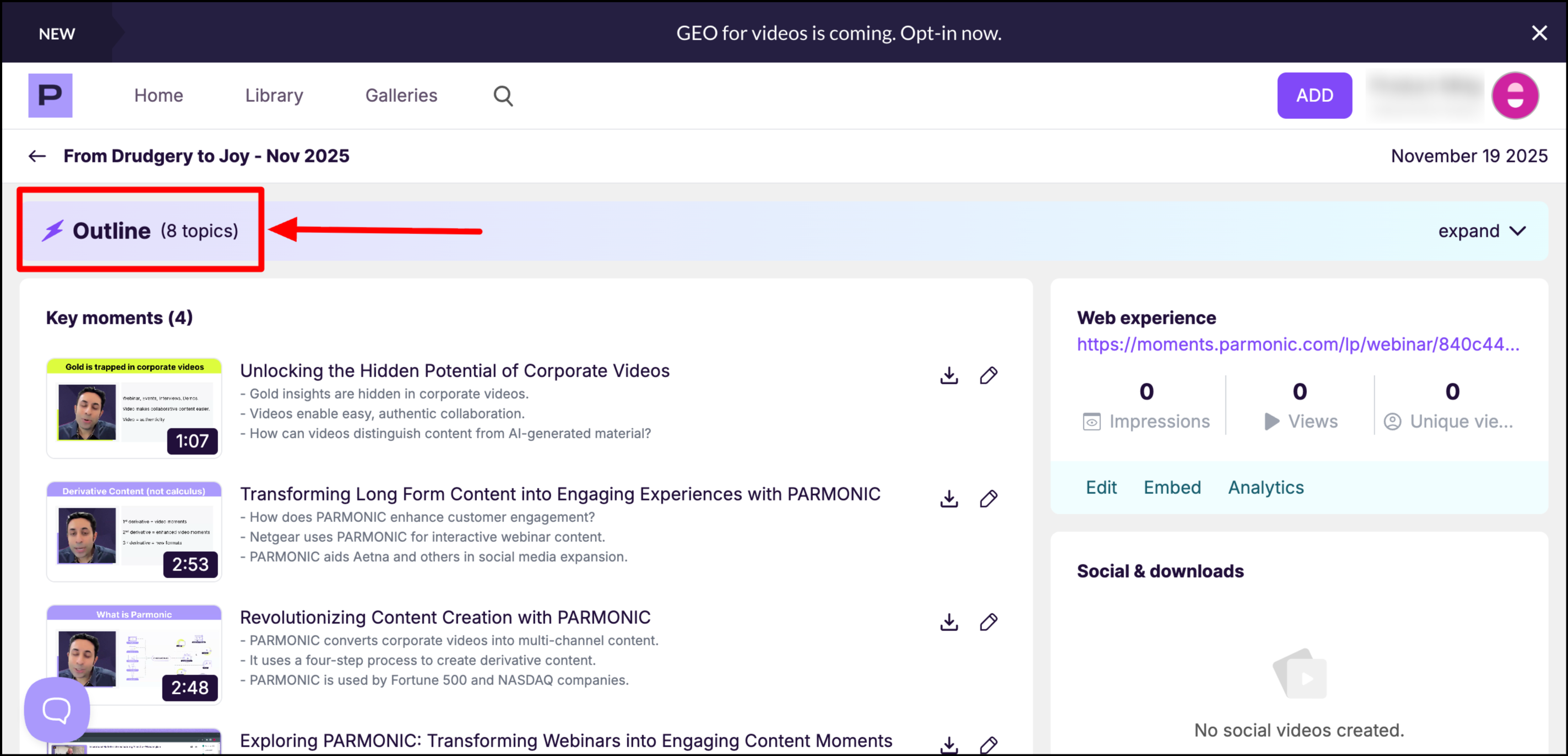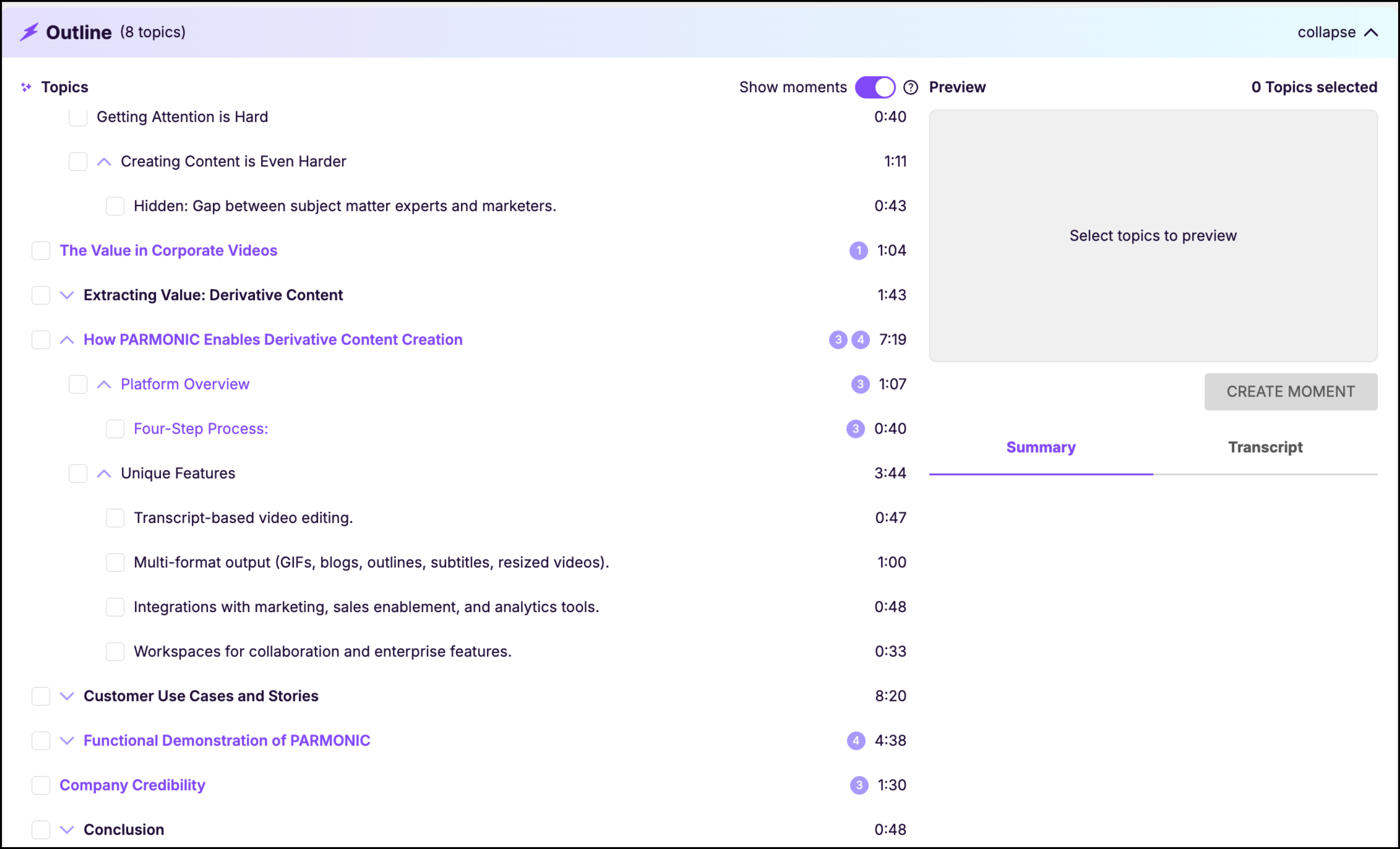 Each topic or subtopic represents a focused segment of the video that can be turned into a standalone moment. Learn how.
