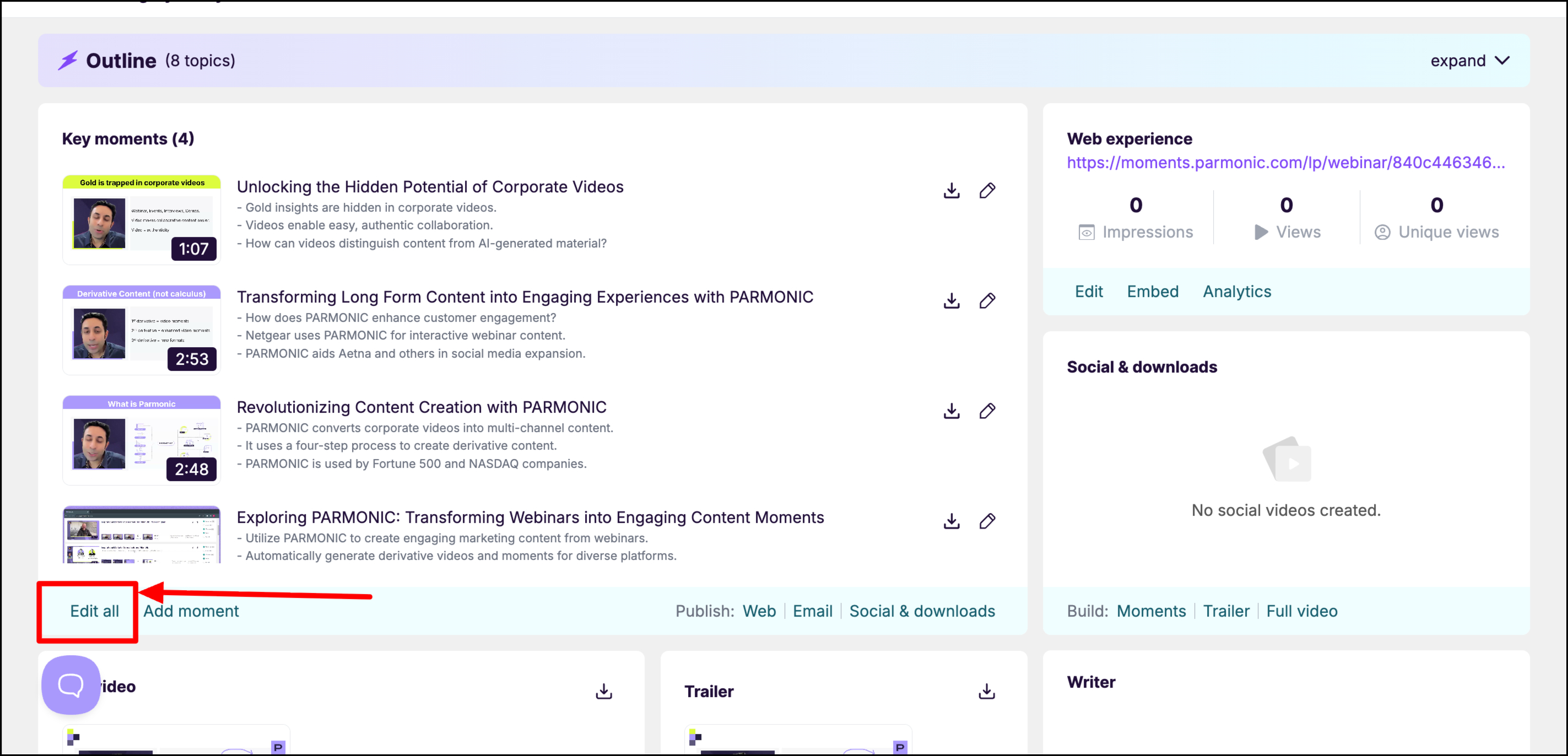 Step 3: Hover over any key moment to view it. Click on "Edit all" at the bottom of the Key moments module to review the highlighted transcript and edit the moments.