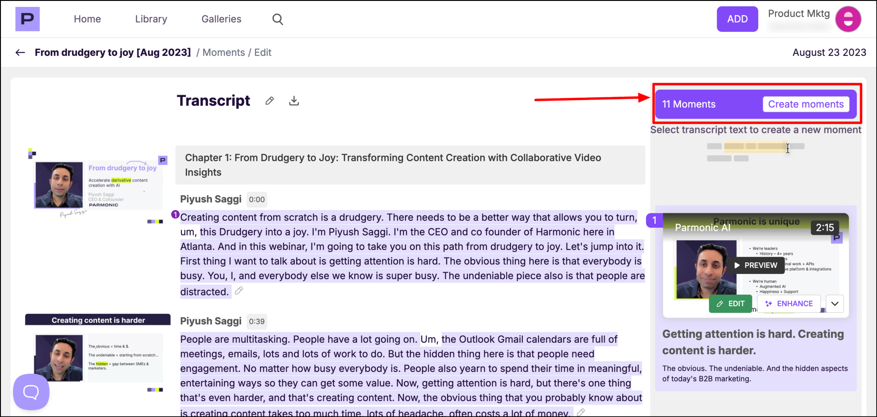Step 3: You'll see all the moments Parmonic has created from the long video. To create a new moment, click and drag from the first word you want to be included to the last word. Then click on "Create Moment".