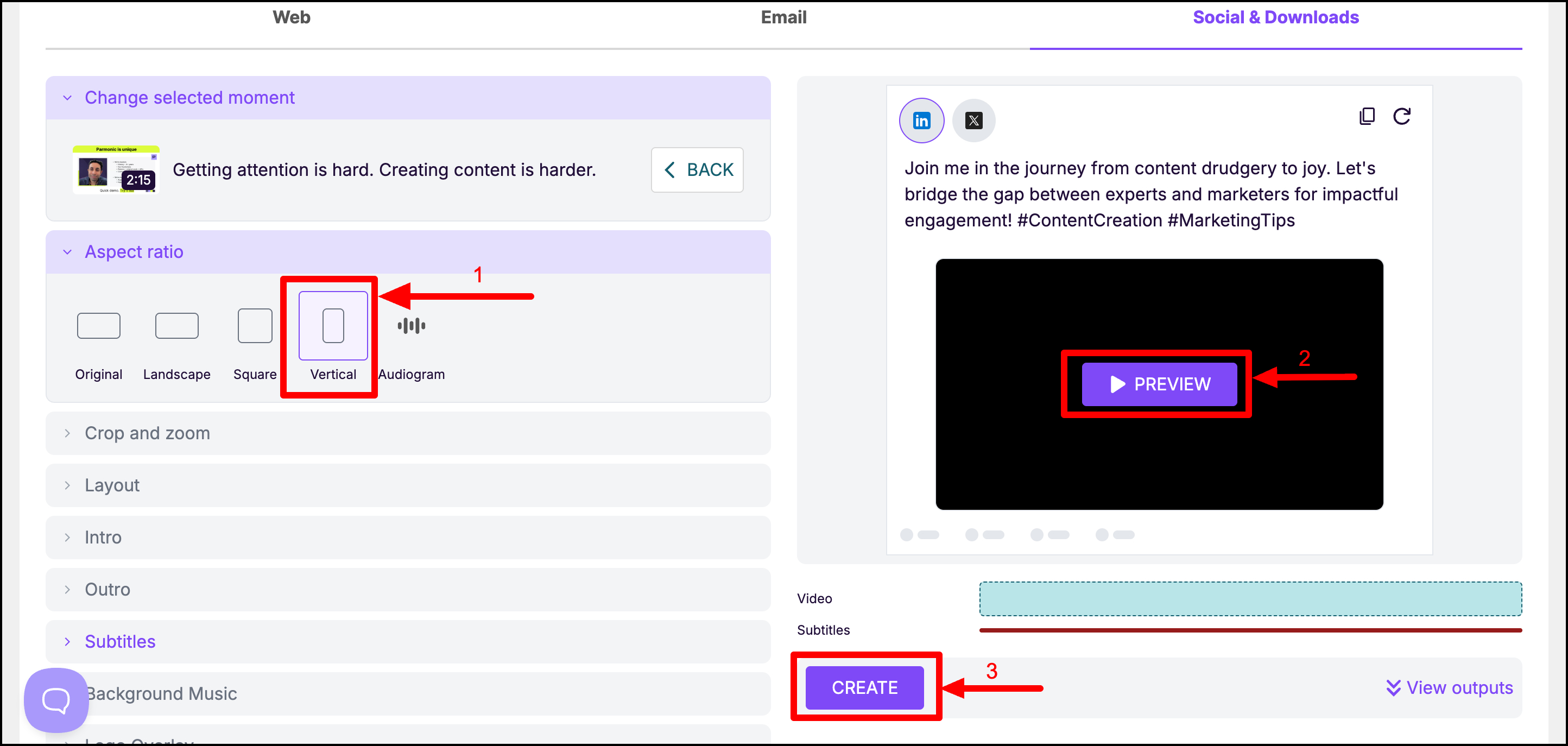 Step 4: Go to the aspect ratio section and click on "vertical Video". Preview the changes and hit 'Create' to create the mp4.