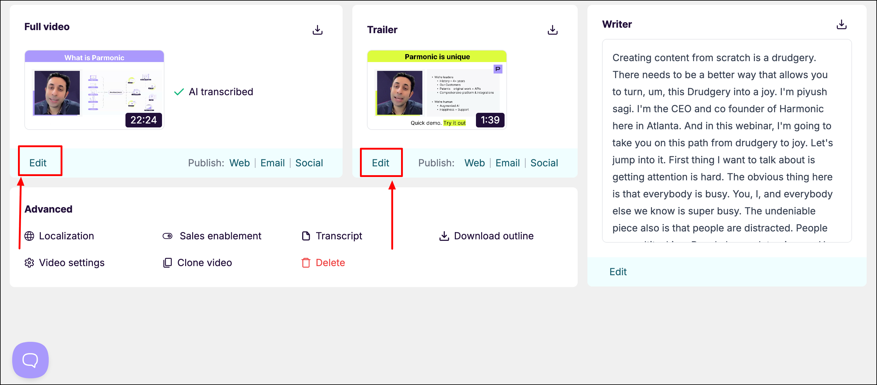 - Go back to the video dashboard. To add Speaker Badges to all the moments, click Edit All as highlighted below. To add speaker badges to a specific moment, click on the edit icon next to that moment.