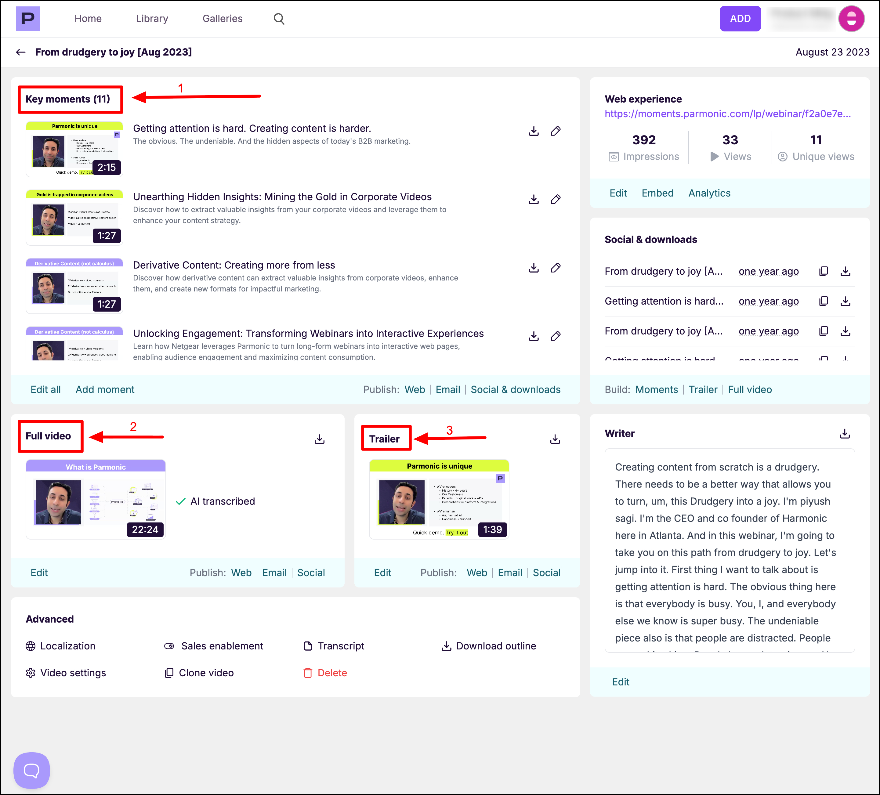 For every video processed in Parmonic, you will see these 3 objects in the video dashboard along with other advanced capabilities.