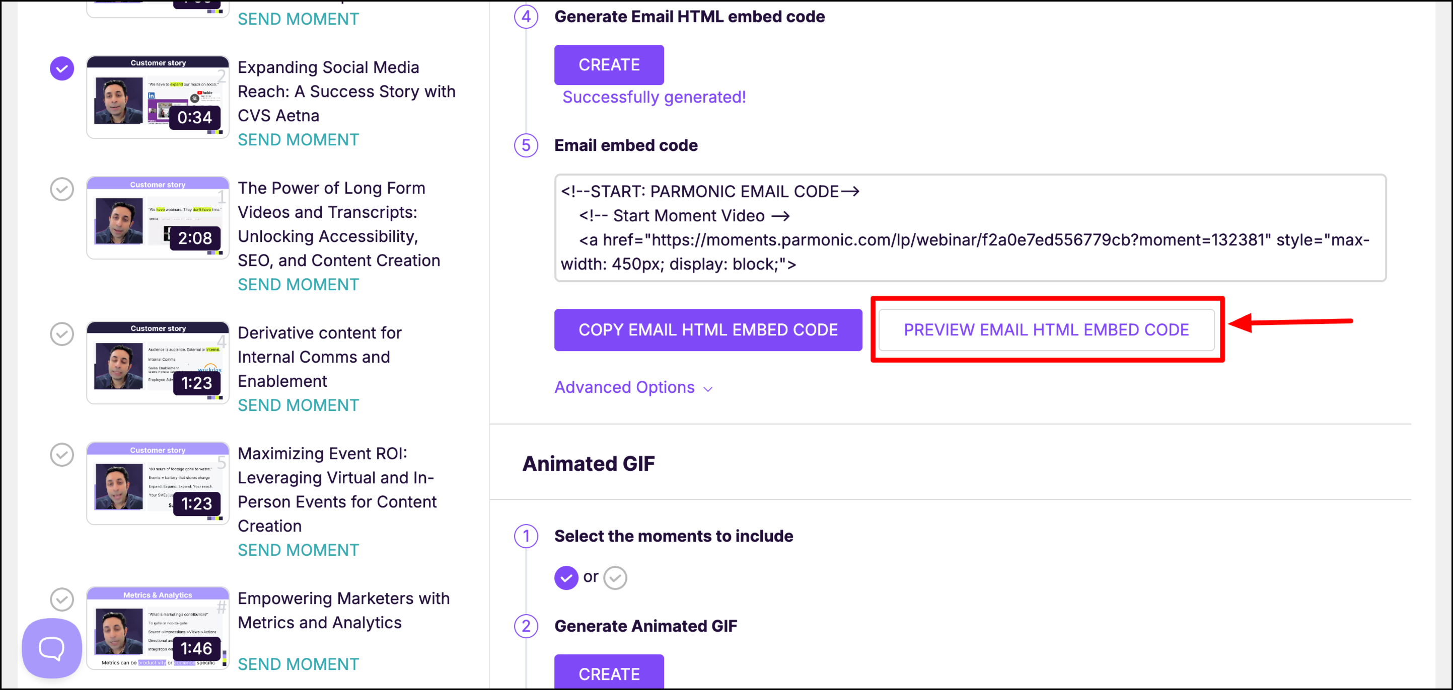 Step 5: To get the link of a particular moment, click on 'Preview Email HTML Embed Code'. This preview shows you exactly how your Moments will appear in the body of your email.