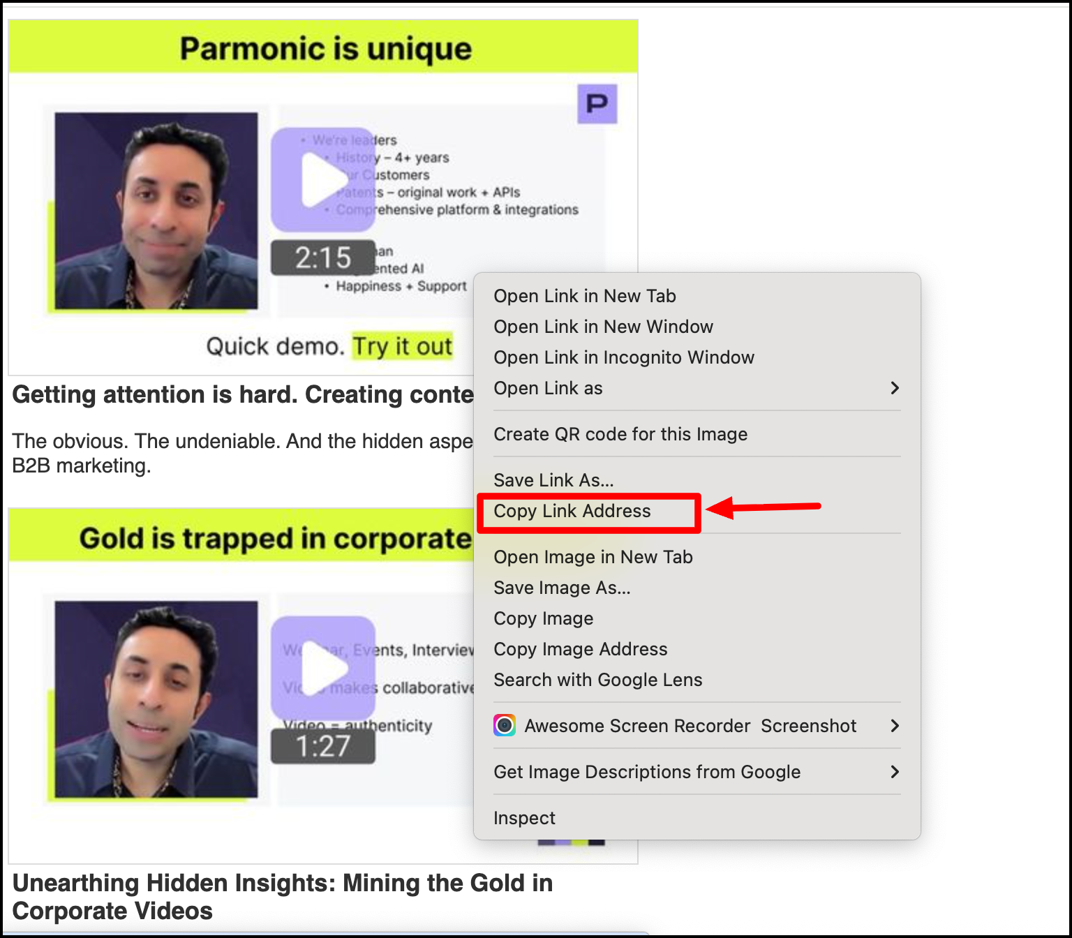 Step 6: Each thumbnail in the preview has a URL. You can grab the URL of the moment that you want to include in email and want your audience to watch first. (Right-click the thumbnail and 'Copy link address').