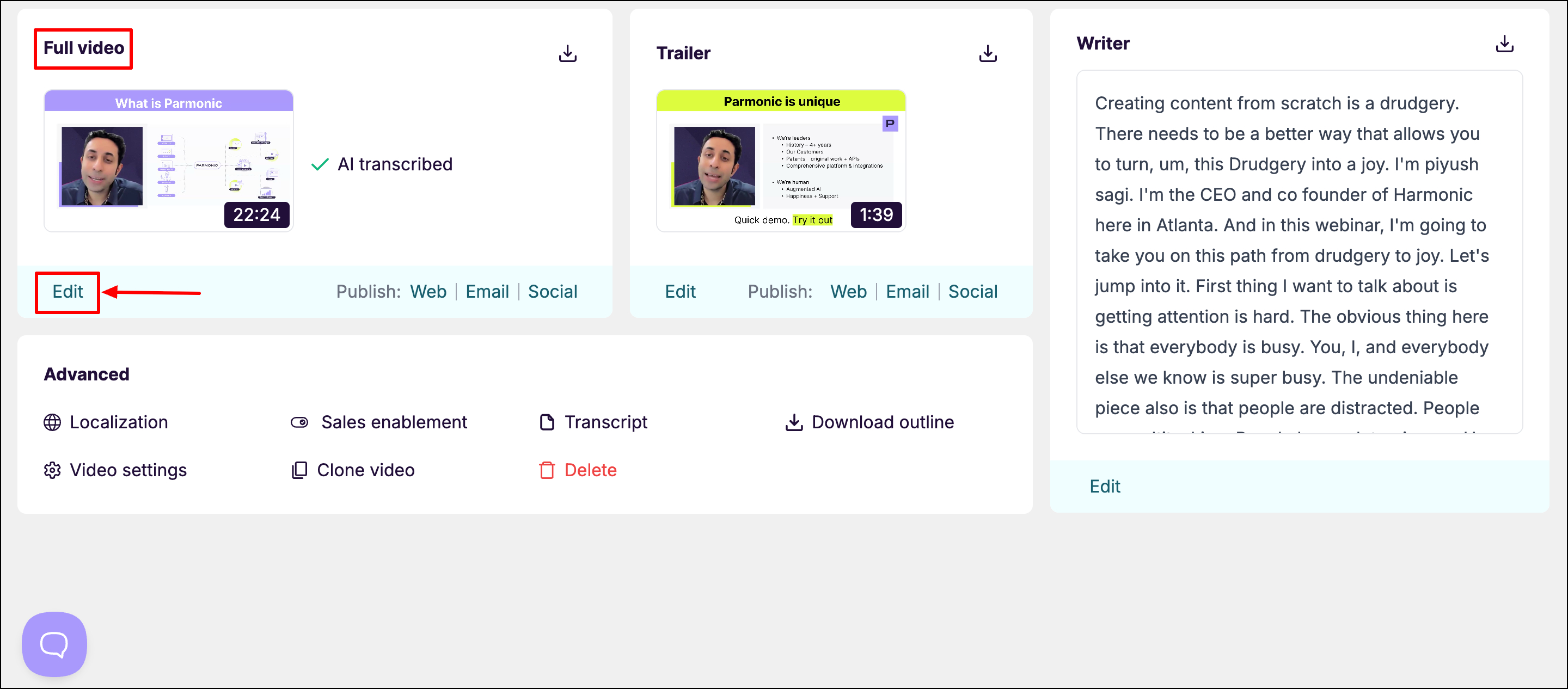 Step 1: On the video dashboard, click on "Edit" at the bottom of the Full Video module
