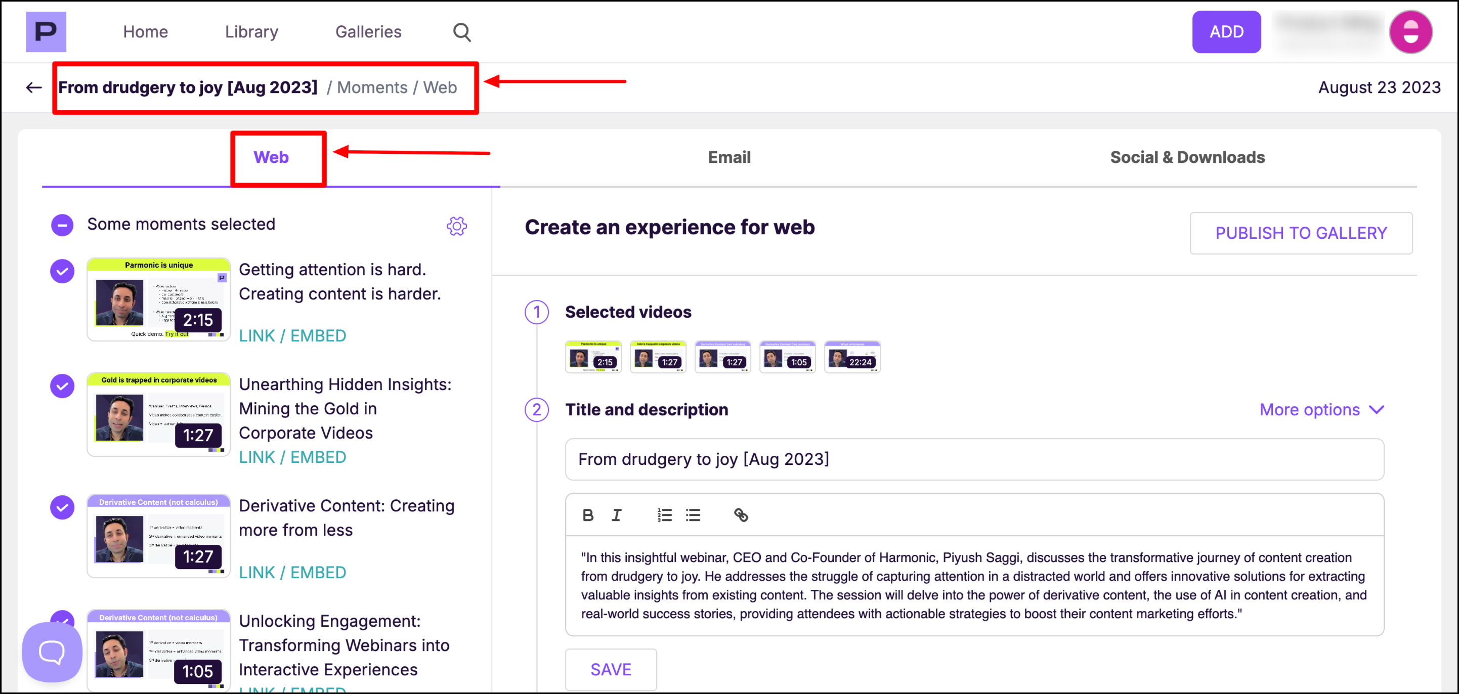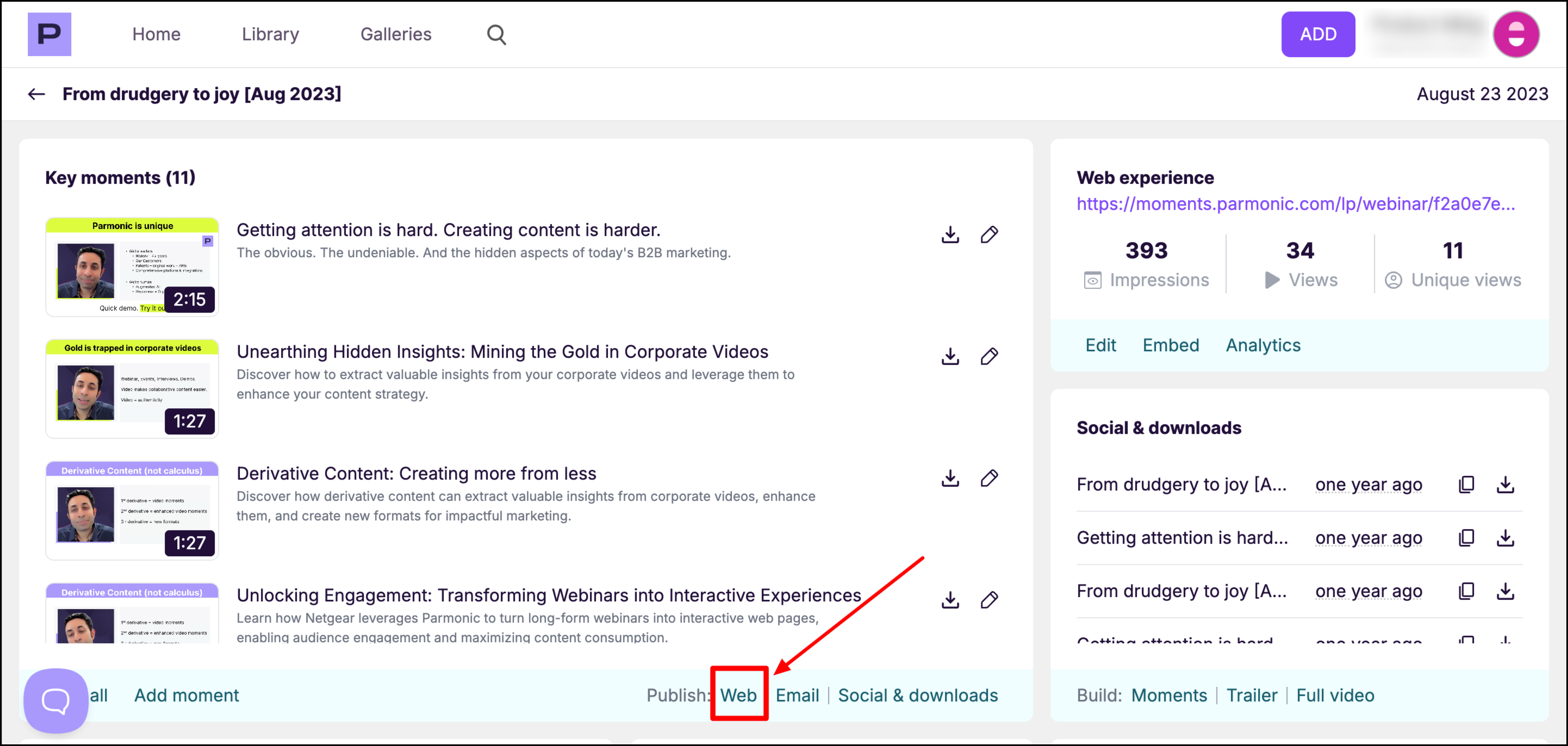 Step 2: Go to the key moments module in the video dashboard and click on the Web link.