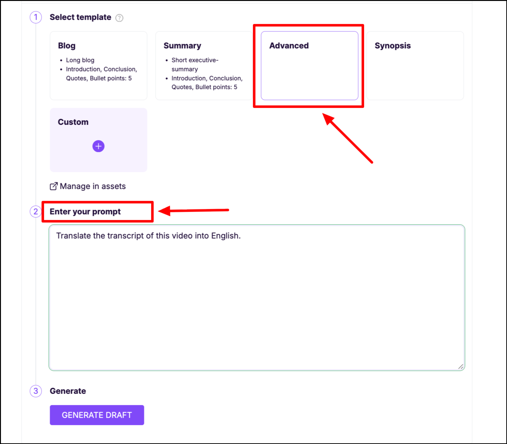 Step 4: Goto Advanced tab and enter the prompt - Translate the transcript of this video into English. Click on Generate Draft to start the translation process.