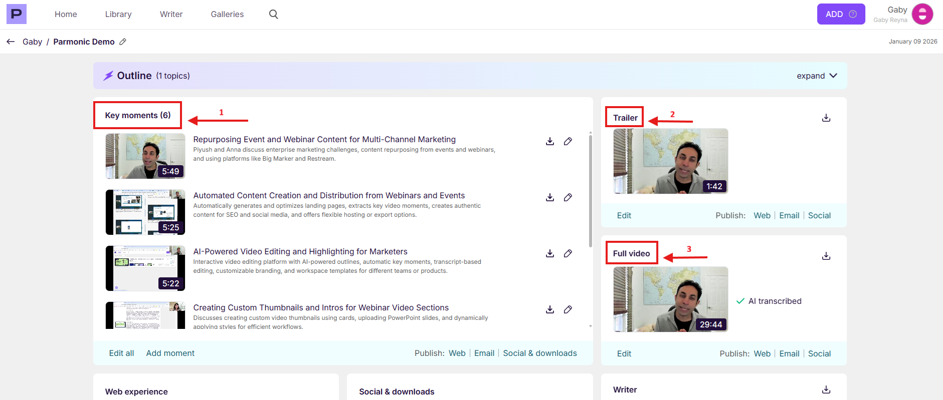 In the top you'll see sections for Key Moments, Trailer outputs, and your Full Video.
