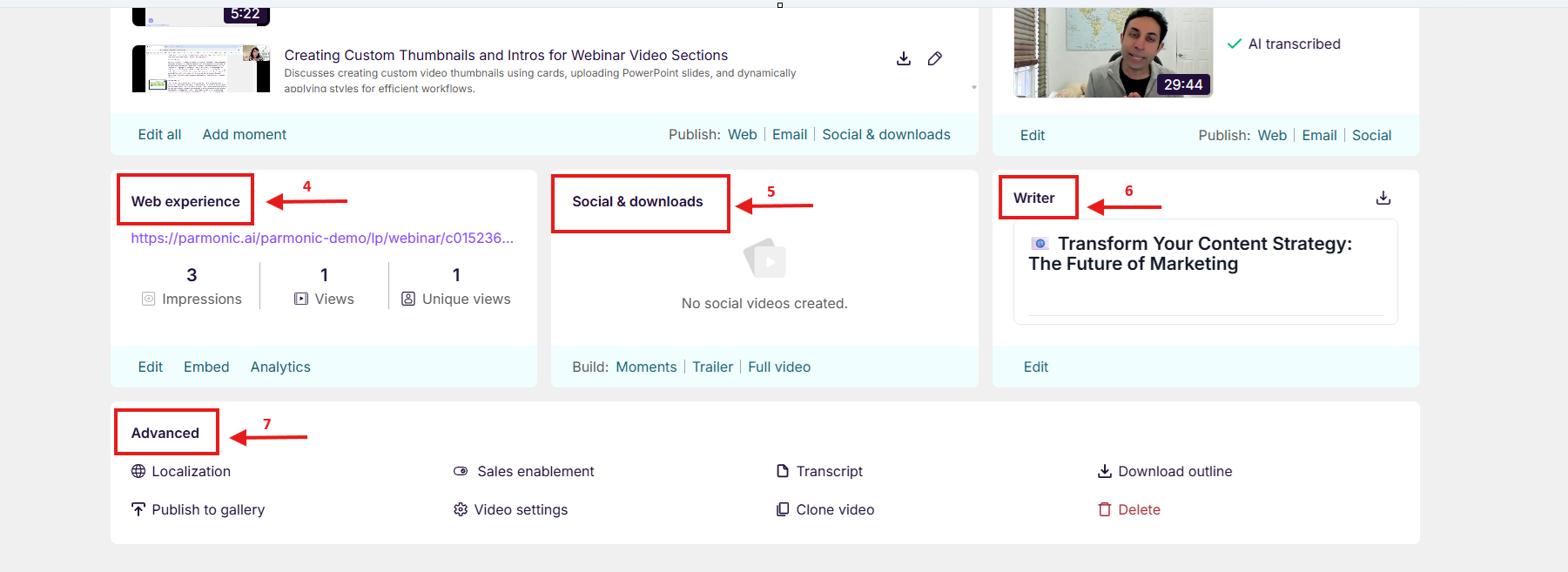 The video dashboard is a simpler, cleaner way for you to easily see what the AI has done and suggested, as well as the main controls that allow you to edit and customize outputs.