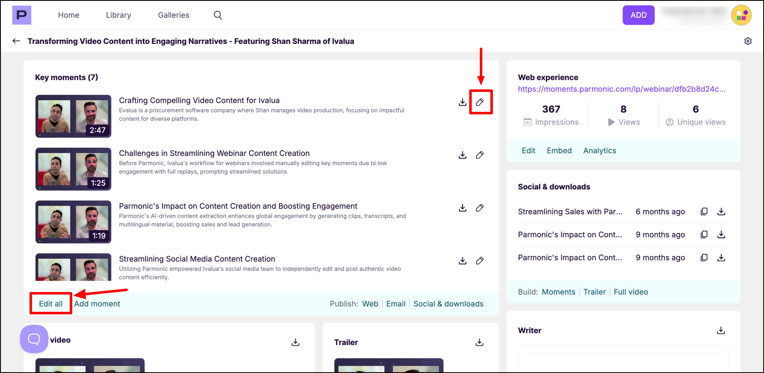 Step 1: Go to the Video dashboard of the video that you want to edit. You can either edit a moment by clicking on the pencil icon or edit all the moments by clicking on 'Edit all' at the bottom of Key Moments module.