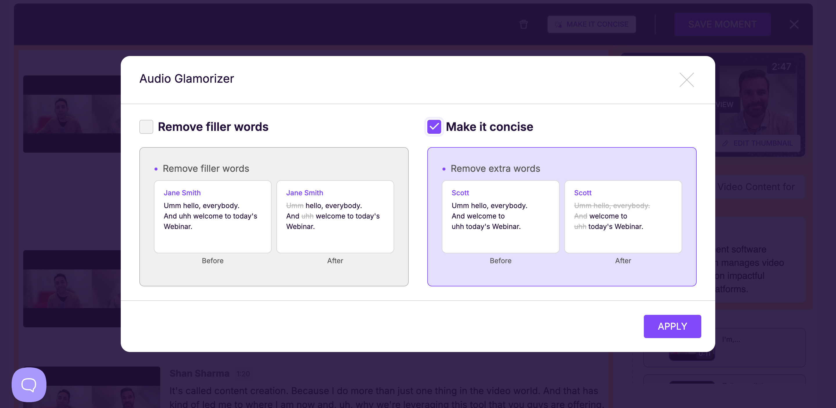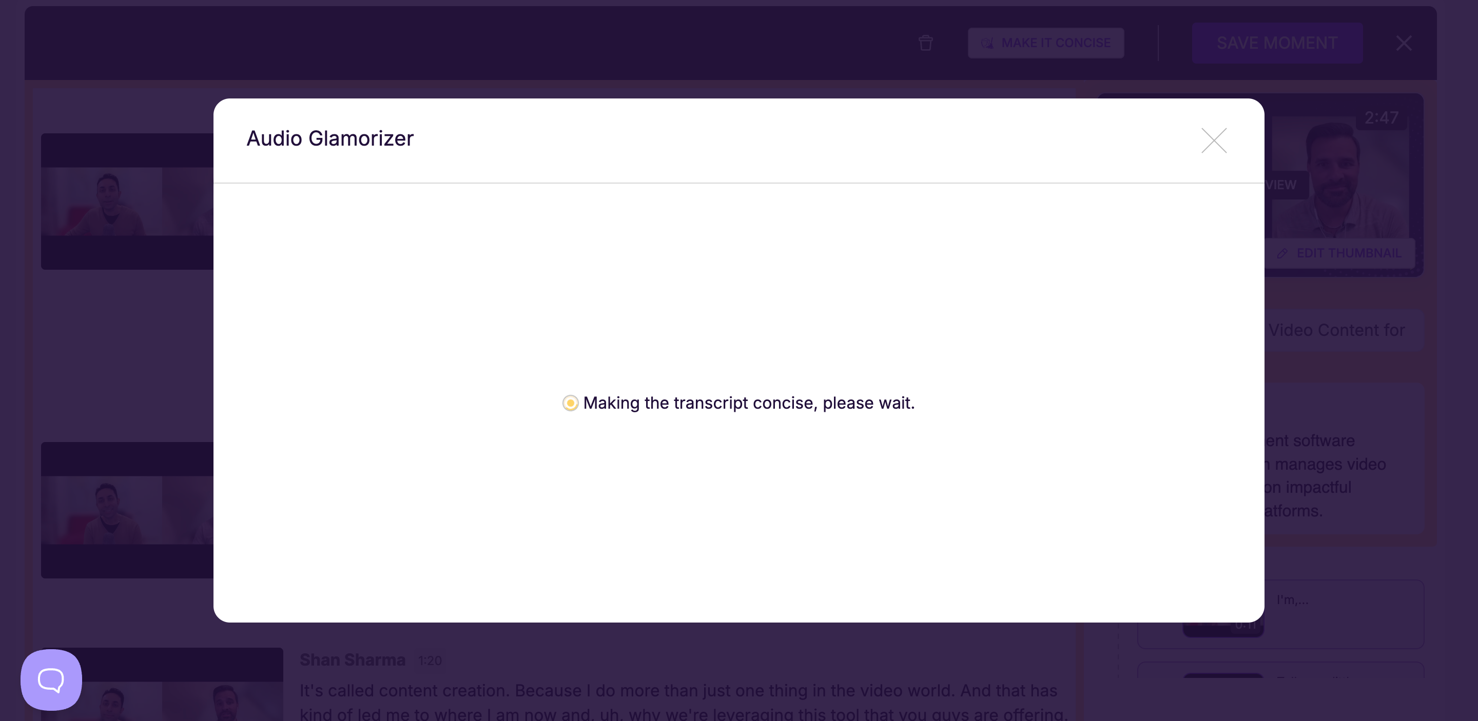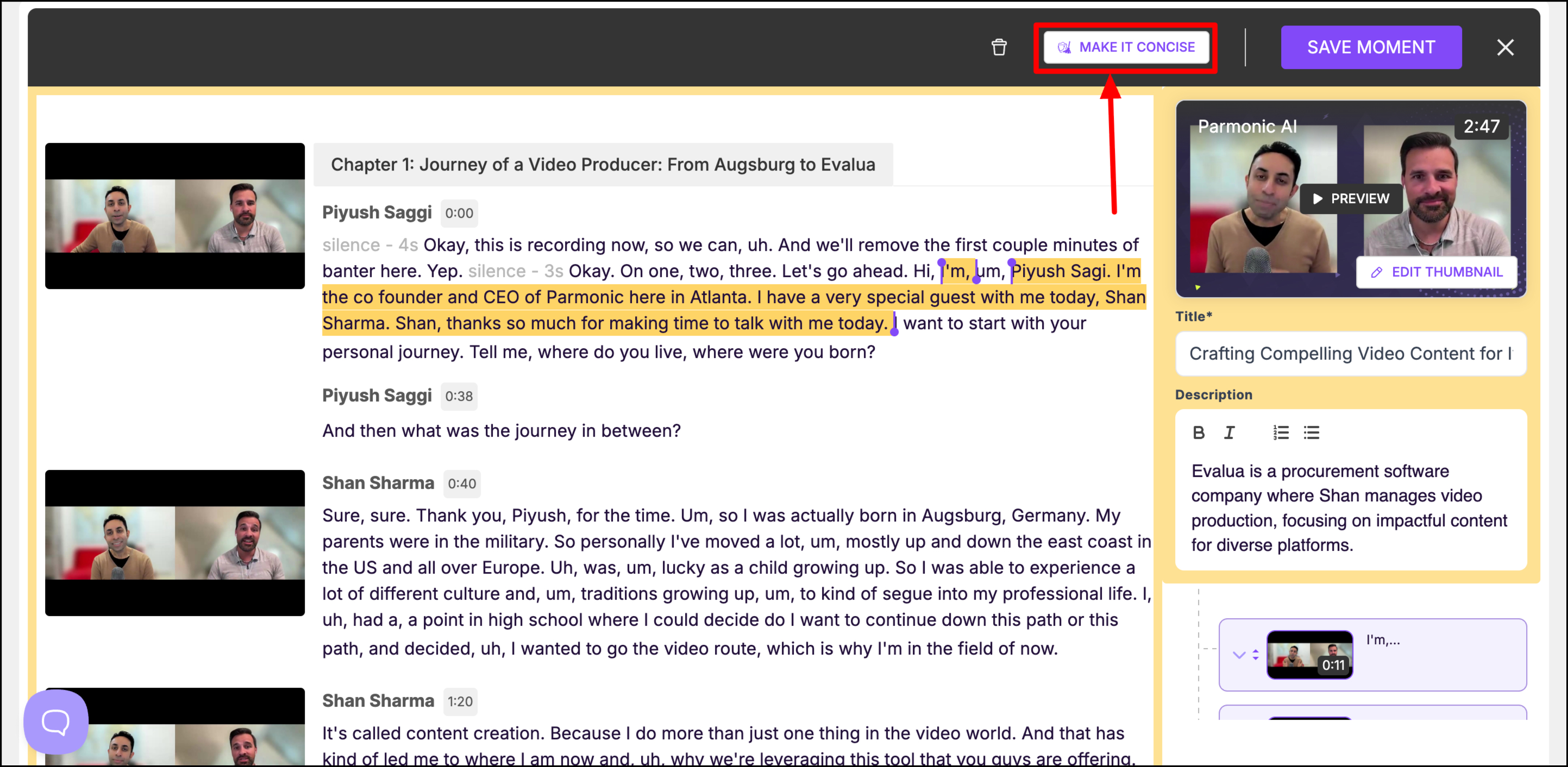 Your team just hosted a 60-minute panel webinar. The recording is packed with valuable insights, but it also has long-winded answers, small talk, and plenty of fluff. With Parmonic’s Make it Concise feature, you can instantly cut out the non-essential parts from your video.