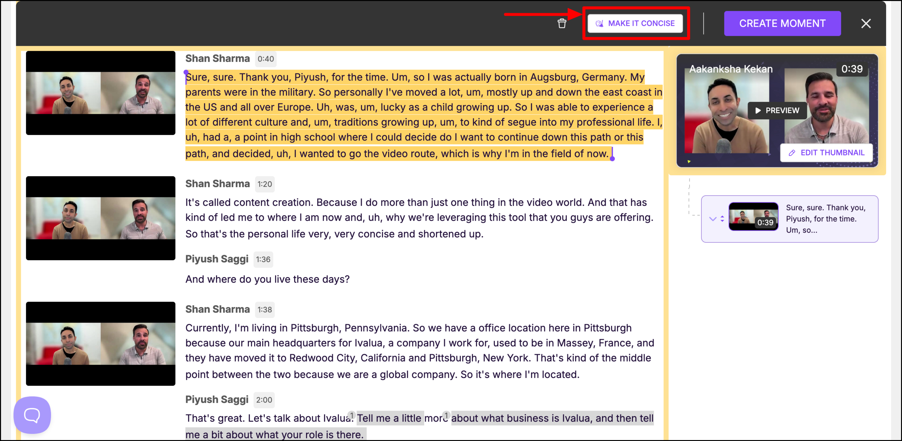 'Make it Concise' feature removes non-essential words, phrases , and sentences, and not just filler words. With a single click, your video becomes shorter, sharper, and easier to read.