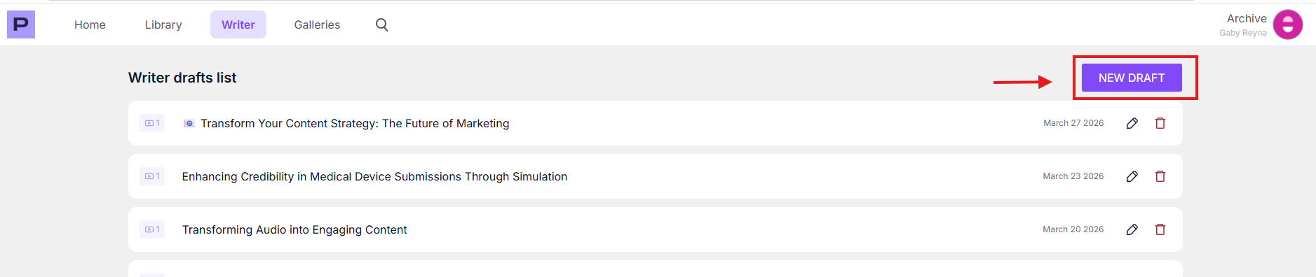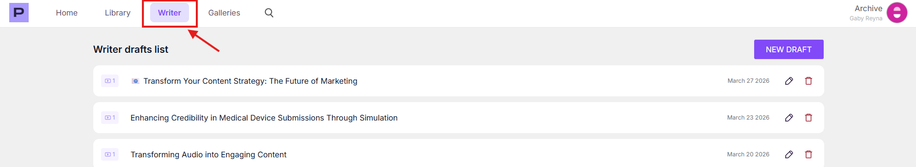 Click the Writer button on the upper left side of the screen. The Writer drafts list shows all the videos you have access to.