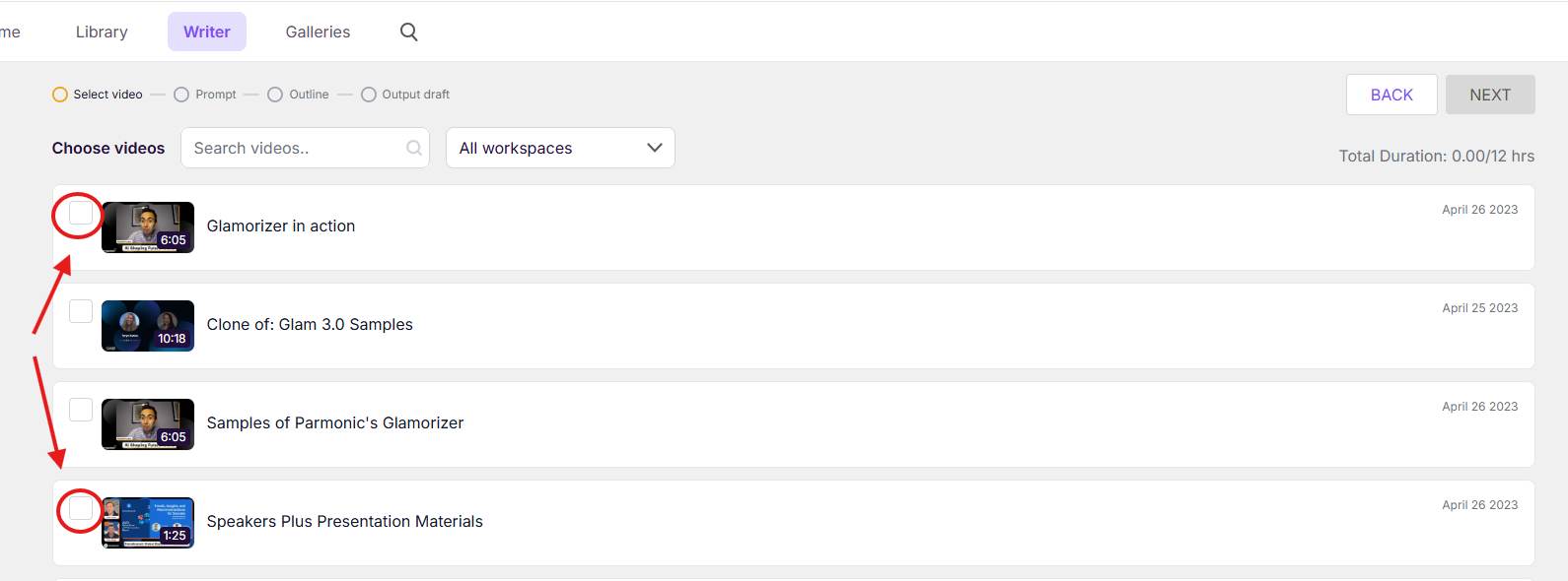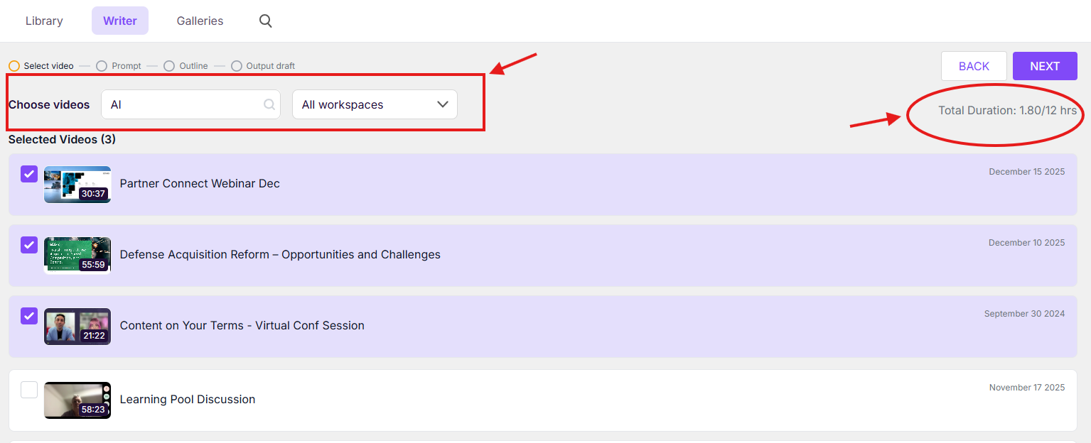 Selected videos will appear at the top for easy reference. The total selected time will be shown in the upper right corner. Use the search bar to find videos. If you’re an admin, you can search across workspaces. Continue to the next step by clicking on 'NEXT'.