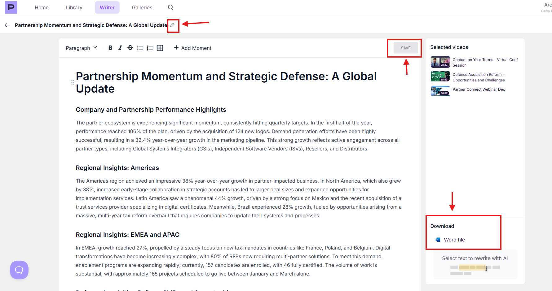 The system will create your blog draft (this may take a few minutes). You can edit the title and body directly. To rewrite a section, highlight the text and click Rewrite. Once you're satisfied, click 'SAVE' and download your blog.