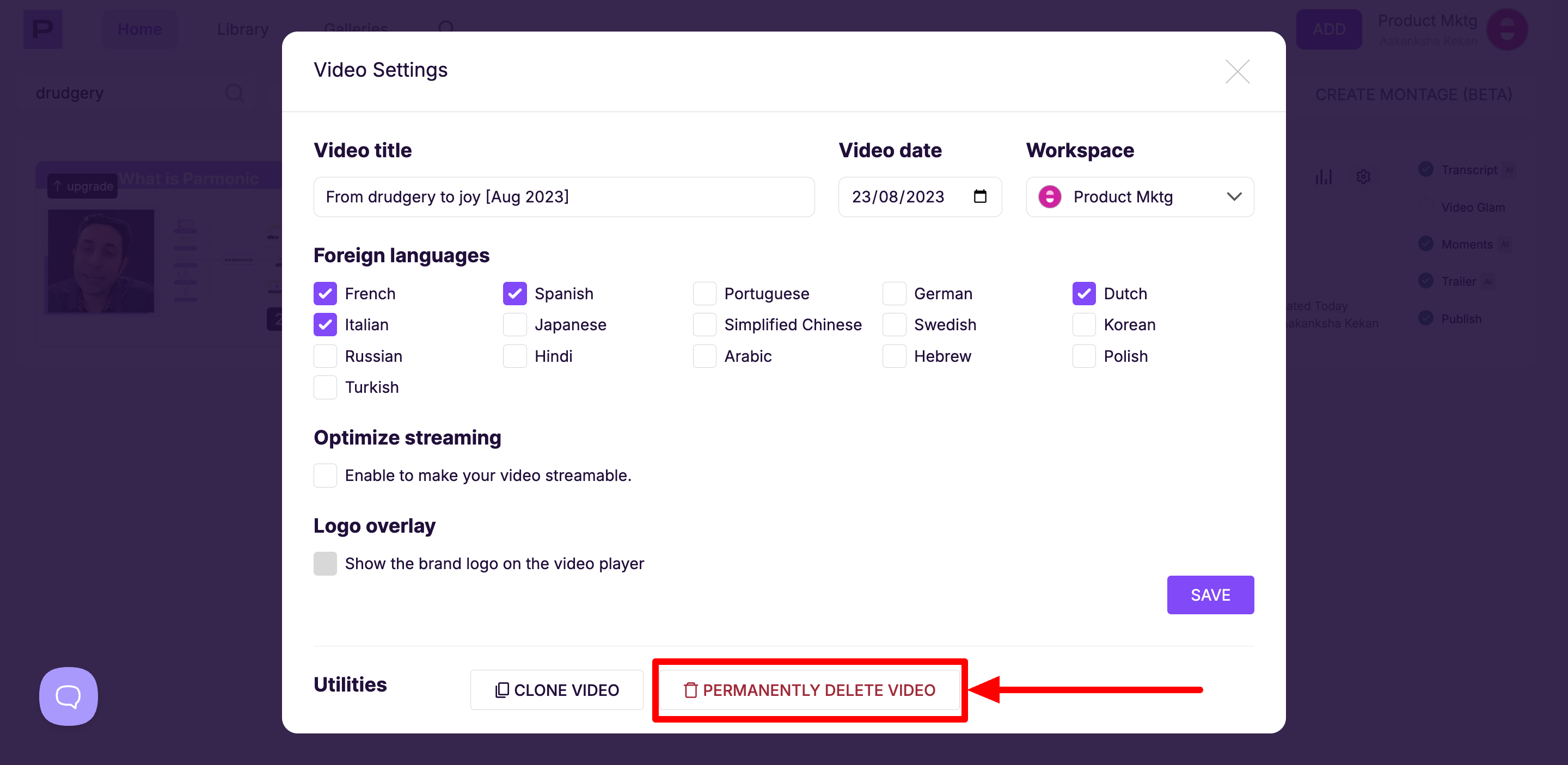 Deleting a Video from Parmonic