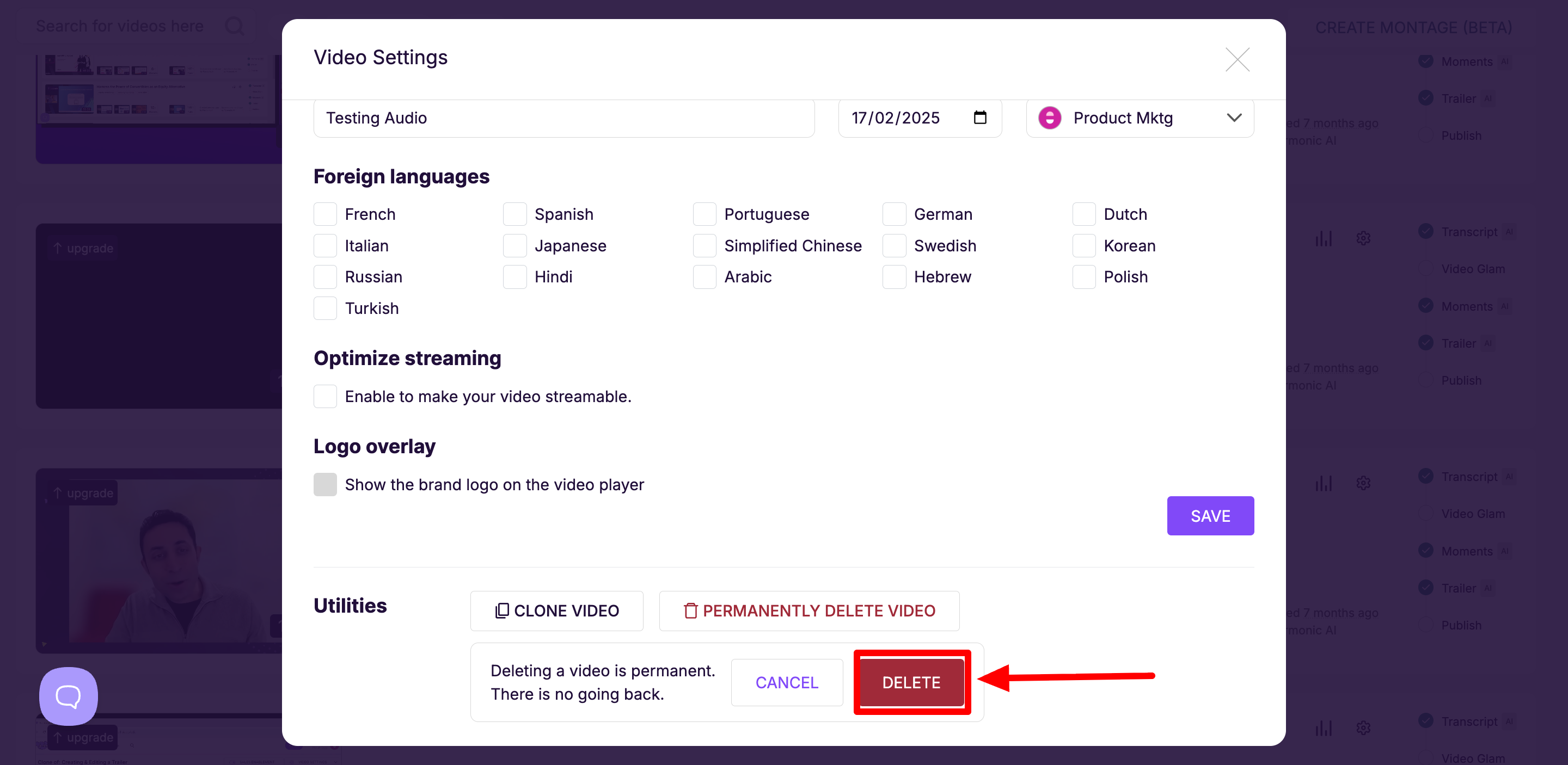2. Click PERMANENTLY DELETE VIDEO