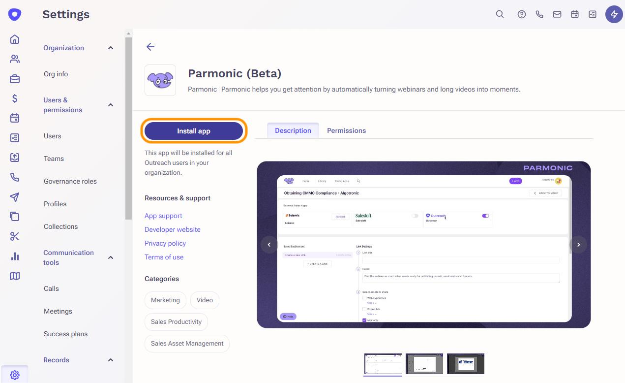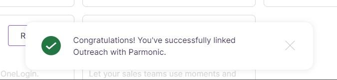 Step 2: Click on the Connect button in the Outreach pane and follow the instructions. You will be redirected to Outreach to authorize Parmonic.